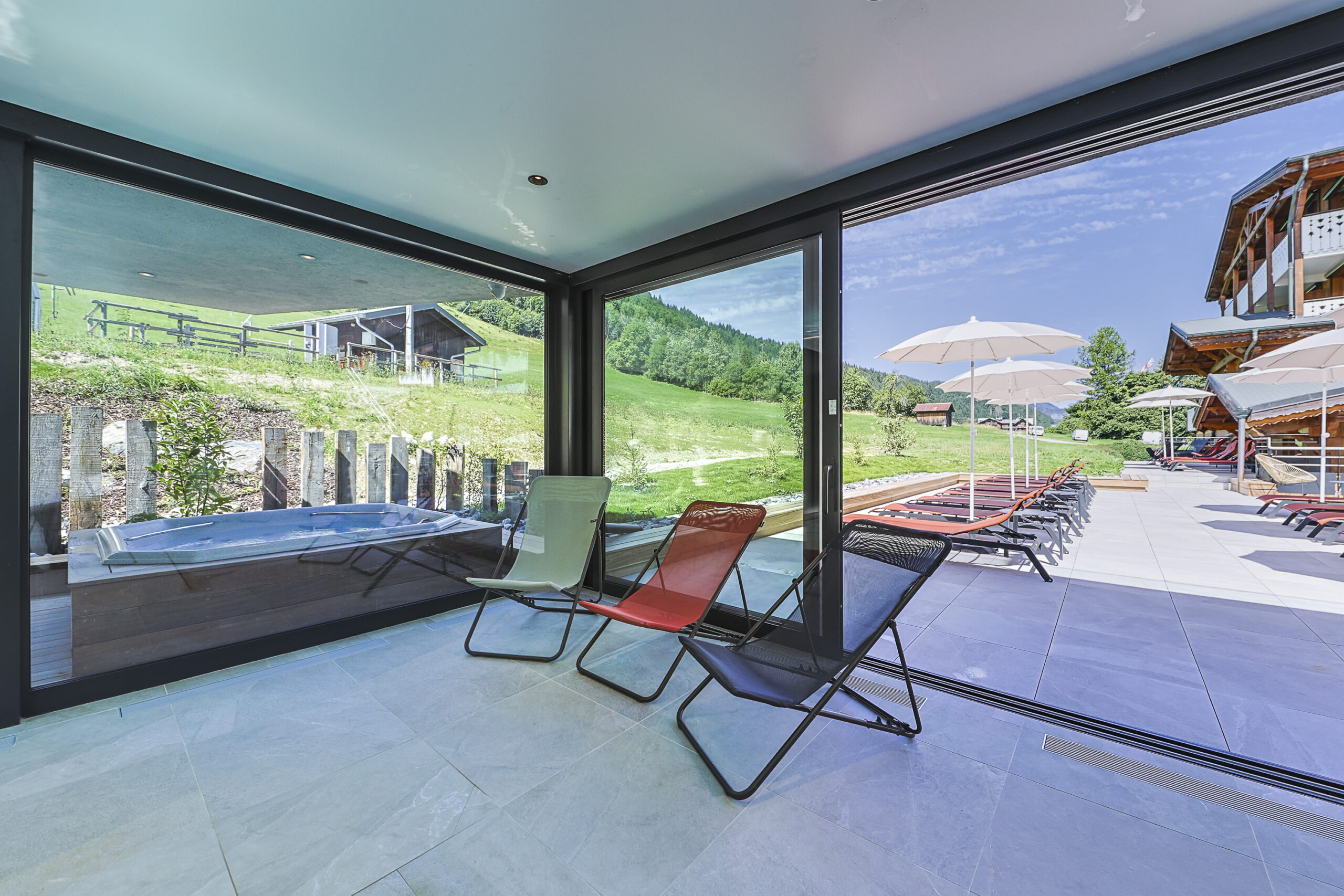 Relaxez-vous dans le jacuzzi extérieur (chauffé à 34°) avec vue sur les pistes du Pleney en hiver et les champs en été !